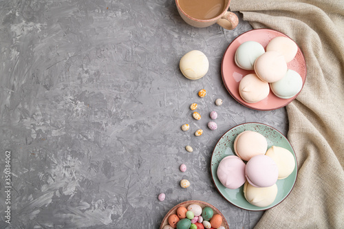 Colored zephyr or marshmallow with cup of coffee and dragees on a gray concrete background. top view, copy space.
