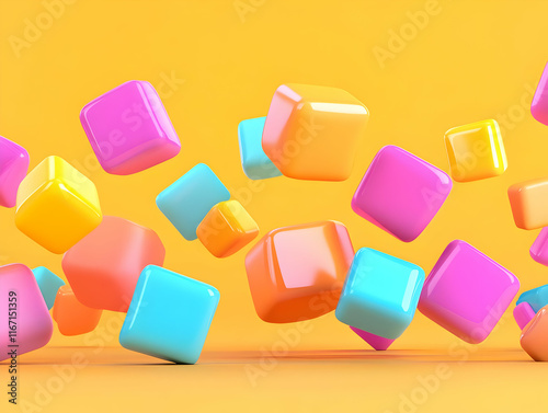 three-dimensional, abstract, background, cube, colourful, geometric, shape, vibrant, design, illustration, art, texture, glossy, render, modern, graphic, wallpaper, pattern, digital, dynamic, playful, fun, bright, cheerful, yellow background, minimal, simple, clean, creative, abstract art, modern art, graphic design