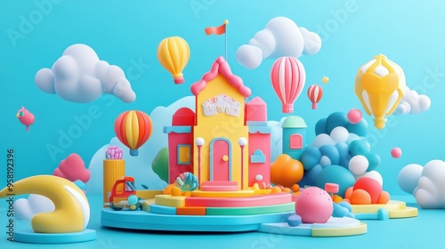 Colorful 3D Illustration of a Toy School with Hot Air Balloons