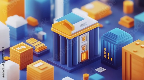 Colorful 3D Representation of a Bank Building Surrounded by Financial Elements in a Vibrant Cityscape