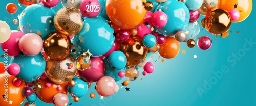 three-dimensional, abstract, background, ball, balloon, celebration, colourful, confetti, design, festive, holiday, illustration, new year, party, pattern, sphere, star, texture, 2025, new year's eve, new year's day