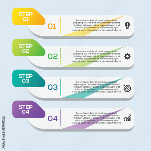 Colorful 4-step infographic with modern numbered banners and icons on light background.