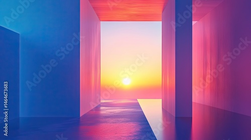 interior, architecture, colourful, sunset, view, geometric, light, vibrant, bright, wall, cube, structure, design, modern, brightly, pink, blue, red, orange, yellow, sun, horizon, pool, space, empty, perspective, depth, artistic, digital, rendering, three-dimensional, modernist, contemporary, abstract, high-coloured, gradient, warm