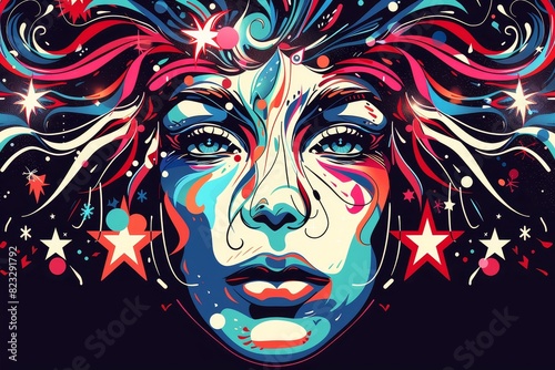 colourful, abstract, illustration, woman, face, vibrant, pattern, star, element, blend, trendy, fantasy, flamboyant, graphic, lavish, ornate, fashion, tempting, female, charming, texture, surreal, visual, portrait, facial