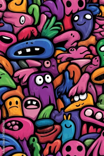 monster, abstract, colourful, expression, shape, vibrant, lively, character, design, illustration, pattern, playful, imaginative, creativity, art, fun, quirky, eye, mouth, happiness, sorrowful, whimsical, cartoon, creature, smile, frown, fantasy, joyful, surreal, texture, layout, visual, energetic, background, digital, bold, bright, composition, interaction, unique, personality, character, cartoonish, diverse, high-coloured, creature, designing