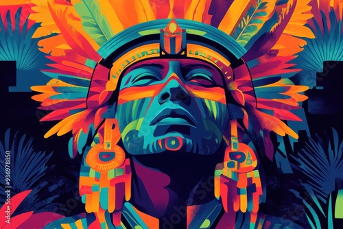 face, portrait, abstract, art, colourful, bright, high-coloured, vibrant, bold, graphic, design, geometric, pattern, shape, line, feather, headdress, ornament, decoration, tribal, culture, traditional, indigenous, native, ethnic, style, digital, illustration, artwork, painting