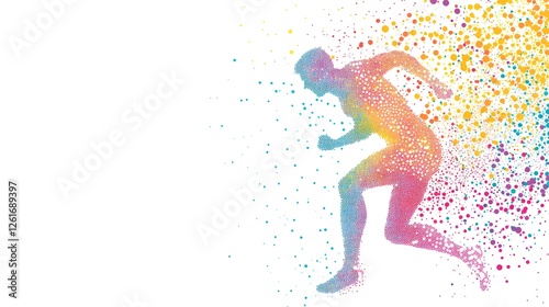 runner, running, athlete, sprint, dot, colourful, abstract, motion, speed, energy, dynamic, vibrant, dissolve, disintegration, pixel, point, colours, spectrum, rainbow, movement, active, fitness, health, sport, exercise, competition, style, artistic, design, illustration, graphic, visual, image, picture, silhouette, shape, form, background, white, particle, disperse, trail, blur, fast, power, intensity, impact, momentum