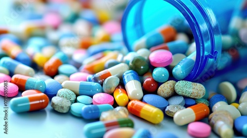 Colorful and Diverse Assorted Pills and Capsules Spilled from Blue Container on Blue Background, Representing Health, Medicine, and Pharmacy Concepts