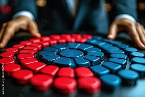 Colorful Arrangement of Circular Game Tokens in a Strategic Pattern on a Dark Surface with Hands in a Business Attire Presenting a Dynamic Overview