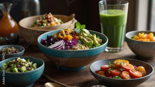 Colorful arrangement of healthy bowls and a green smoothie sitting on a rustic wooden table, promoting a balanced diet
