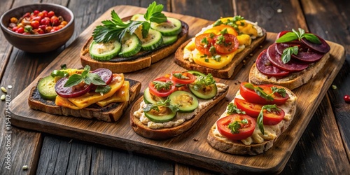 Colorful arrangement of roasted vegetable and hummus open-faced sandwiches on a dark wooden board , dark wood