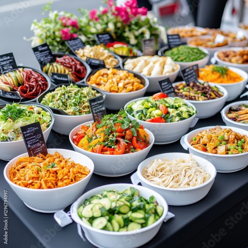 Colorful Array of Fresh and Healthy Dishes Displayed in Bowls at an Outdoor Food Market