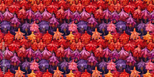 seamless, pattern, wallpaper, vibrant, flower, colourful, hanging, artistic, red, purple, orange, display, flower petals, nature, garden, botany, flora, floral, bloom, blossom, high-coloured, lush, decorative, textured, design, intricate, elegant, foliage, plant, horticulture, striking, detailed, cascade, arrangement, lively, bright, aesthetic, organic, cheerful, kaleidoscope, beautiful, harmonious