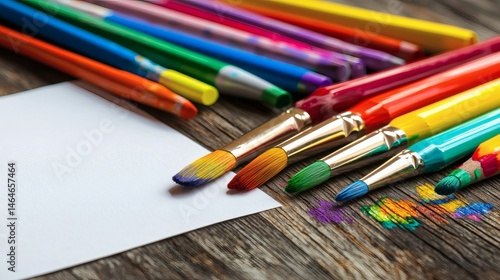 Colorful Art Supplies on a Wooden Table with Blank Paper for Creative Inspiration and Design
