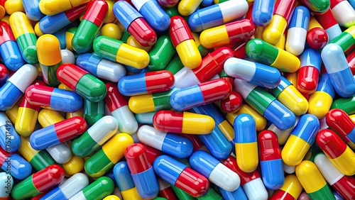 Colorful assortment of medication pills including red, green, blue, and yellow pills, medicine, drugs