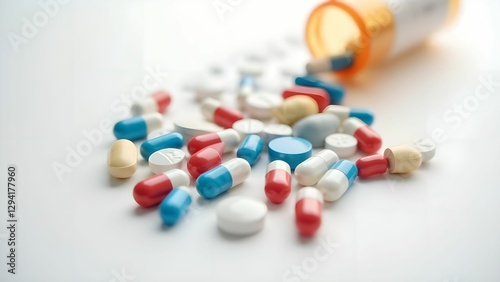 Colorful assortment of pills and capsules scattered on a surface after coming out of a container