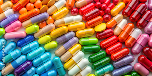 Colorful assortment of pills in a rainbow of hues , pills, pharmaceuticals, medication, tablets, capsules, health