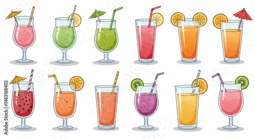 drink, fruit, goggles, juice, colourful, straw, umbrella, lemon, orange, kiwi, watermelon, purple, red, green, yellow, pink, illustration, pattern, summer, variety, collection, refreshing, delicious, tasty, tropical, vibrant, healthy, patterned, design, isolated, background, set, mix, colourful