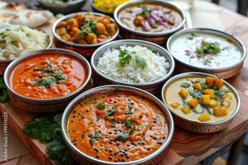 Colorful Assortment of Traditional Indian Dishes in Bowls on Wooden Table