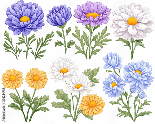 Colorful aster flowers bouquet illustration on white