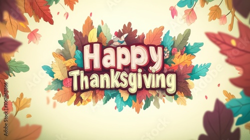 Colorful autumn leaves surround cheerful Happy Thanksgiving text, creating festive and warm holiday atmosphere