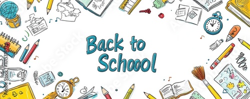 Colorful back to school background with stationery like pencils, books, and an alarm clock