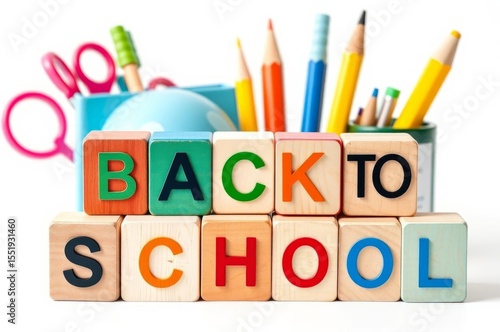 back to school, wooden blocks, school supplies, colourful, education, learning, children, classroom, crayons, eraser, notebook, ruler, scissors, marker, white background, vivid colors, preschool, kindergarten, playful, creative, stationery, children, office supply