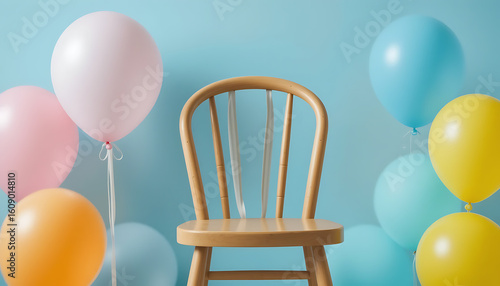 Colorful balloons float around a wooden chair against a blue wall. Celebration.