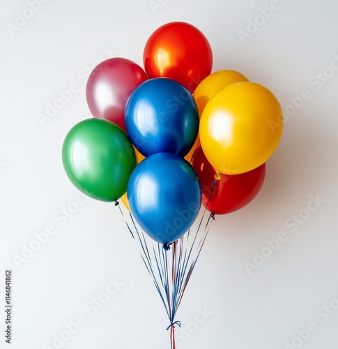 Colorful balloons in various hues float gracefully against a white backdrop, perfect for festive occasions and