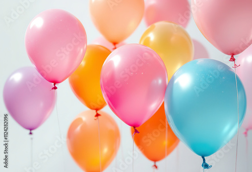 Colorful balloons in various shades of pink, orange, and blue floating against a white background