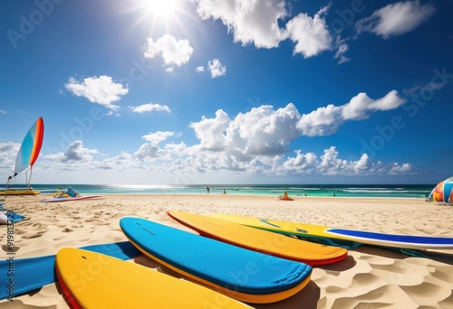 colorful beach equipment arranged neatly bright towels under sunny skies, vibrant, accessories, summer, sand, ocean, seaside, vacation, leisure, outdoor