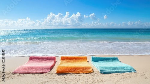 Colorful beach towels laid out on the sand, with a calm ocean in the background. Clear sky for copy