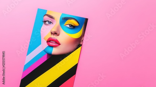 Colorful Beauty Portrait with Geometric Shapes on Pink Background