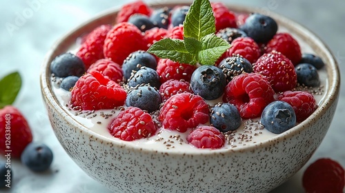 Colorful berry bowl with yogurt and chia seeds garnished with mint leaves for a healthy breakfast option