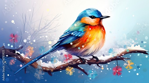 Colorful Bird Adorned with Snowflakes in Winter