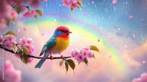 Colorful bird perched on a blooming branch with a rainbow and rain in the background.