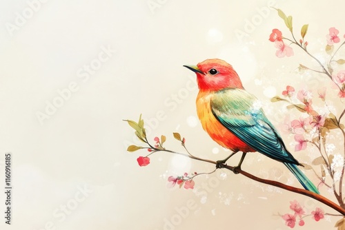 Colorful bird perched on branch, surrounded by delicate blossoms