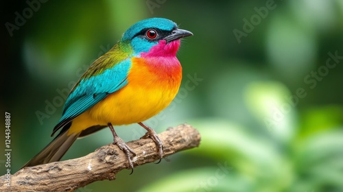 Colorful Bird Perched on Branch with Vibrant Plumage and Green Background