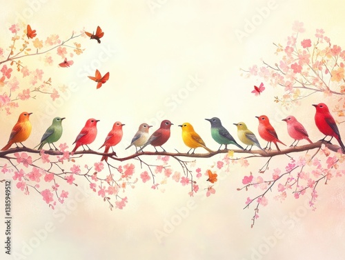Colorful Birds Perched on Blooming Cherry Blossom Branch in Springtime Serene Nature Illustration