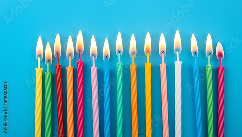 wax, straight, overhead, candle, birthday, decoration, background, light, party, flames, fire, studio, celebration, arrangement, colourful, event, vibrant, blue, line, view