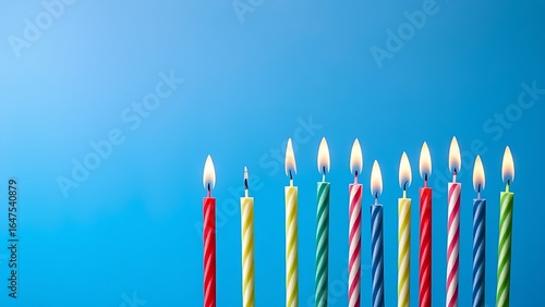 Colorful birthday candles on gradient blue, celebrating joy with overhead soft light and shallow focus.