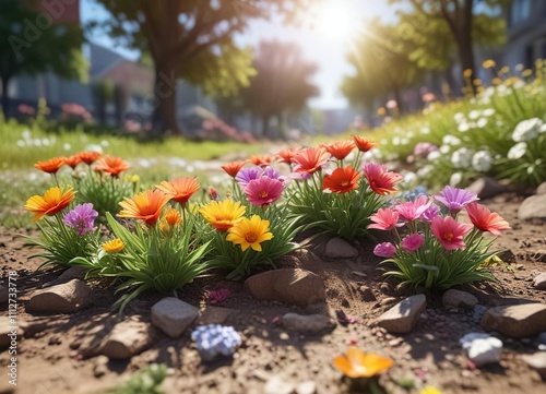 Colorful blooms bursting forth from the ground on a sunny spring morning , flowers, bloom