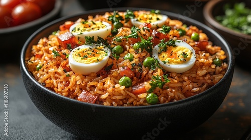 Colorful Bowl of Fried Rice with Fresh Vegetables and Eggs Garnished with Herbs Perfect for a Delicious Meal or Culinary Presentation