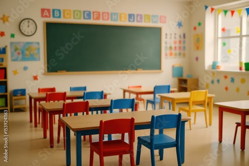 Colorful bright classroom with empty student desks and chairs. Modern school interior background. Education, learning, back to school concept.