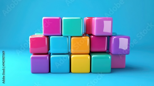 Colorful building blocks stacked creatively on a blue background, ideal for education, playtime, or creative design themes.