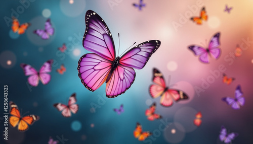Colorful butterflies fluttering in vibrant bokeh, transformation and beauty
