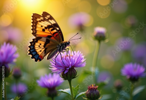 Colorful butterfly perched on a vibrant purple flower in a sunny garden