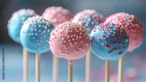 Colorful cake pops, frosted in pink and blue, topped with sprinkles