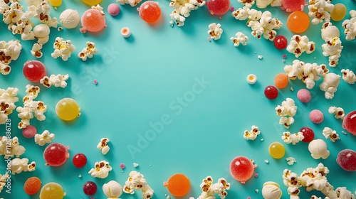 Colorful Candy and Popcorn Arrangement on Vibrant Background