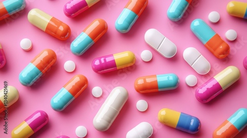 Colorful Capsules and Pills on Pink Background Top View Pharmaceutical Concept Healthcare and Medicine Bright and Modern Style Medical Treatment and Wellness